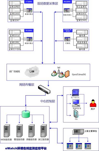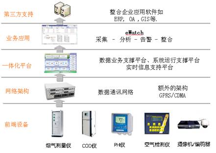 eWatch環境在線監控監測應用平臺實現監控和生產相結合的綜合性應用平臺。平臺由數據中心、一體化應用平臺、綜合監控基礎平臺、業務應用系統和接口服務模塊等組成,在綜合監控基礎平臺上開發圖像監控系統、環境動力監控系統和數采系統等多個業務應用系統;系統可以實現污染源在線監測監控、鋼廠區域視頻監控、煙塵林格曼黑度分析、環境動力監控、語音對講、周界安防監控、智能設備監測等多個應用。